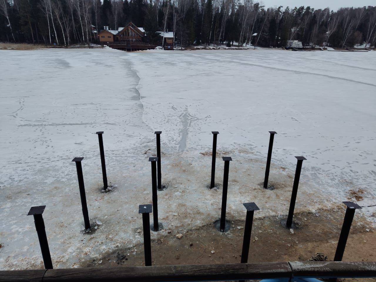 Выбор времени года для проведения работ был неслучайным. Зима является наиболее благоприятным периодом для возведения подобных сооружений на воде. Благодаря крепкому ледяному покрову наши специалисты получили устойчивую площадку для работы, что позволило избежать использования дорогостоящих понтонов или специализированной плавучей техники. Работа со льда дает возможность максимально точно позиционировать каждую опору и контролировать вертикаль при закручивании, обеспечивая идеальную геометрию будущего строения.