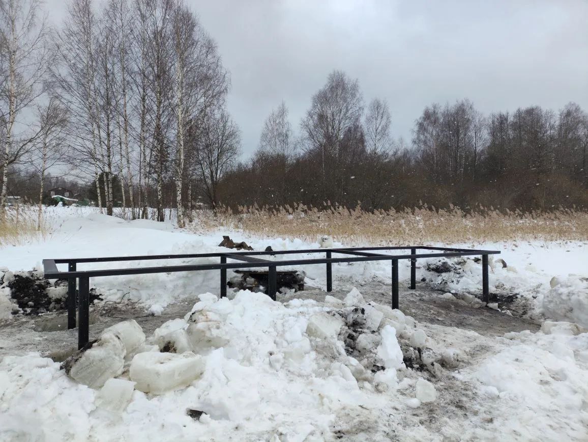 Процесс монтажа начался с точной разметки ледяного зеркала под габариты будущего объекта. Общая длина пирса составила 8 метров при ширине 2 метра. Каждое технологическое отверстие во льду подготавливалось с учетом проектных осей. Погружение 5 метровых стальных опор производилось на расчетную глубину, пока каждая свая не достигла необходимого крутящего момента, подтверждающего ее несущую способность.
