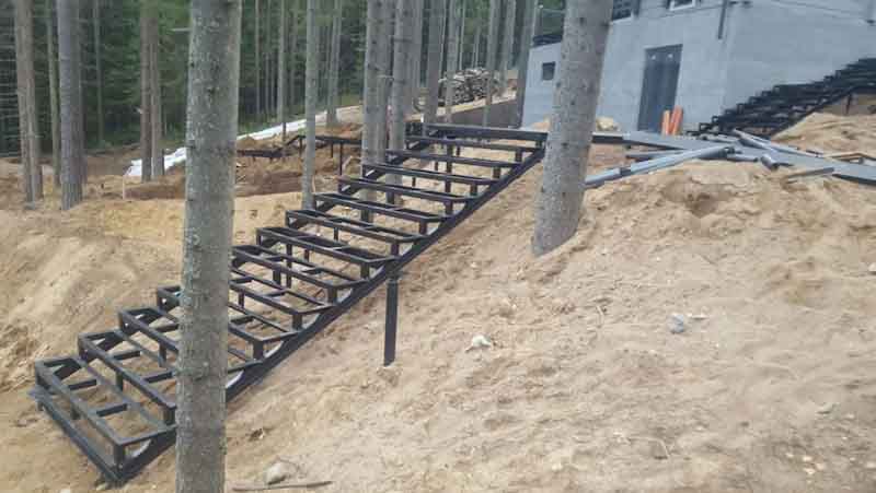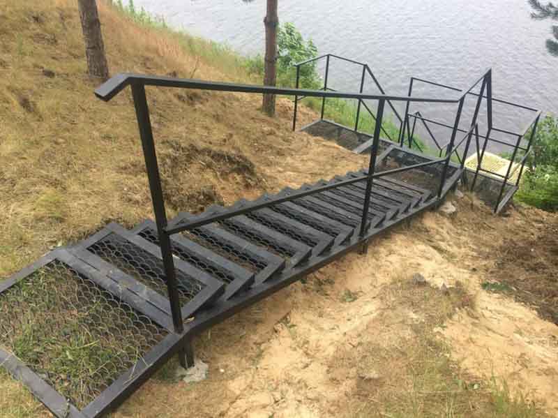 Монтаж спуска к воде в виде лестницы на металлокаркасе и винтовых сваях